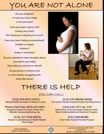 Resource material, like the flyer shown here, and guidance for both providers and parents are available through the Postpartum Resource Center of NY www.postpartumny.org and Postpartum Support International www.postpartum.net. Resource material should be available for immediate referrals. Appointments should be confirmed in the pediatric office and frequent follow-up provided. Early treatment results in the best outcomes for mother and baby and should be obtained as quickly as possible (within a day or two).